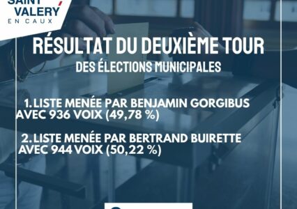 Voici les résultats du second tour des élections municipales à Saint-Valery-en-Caux. Liste menée par Benjamin Gorgibus avec 936 voix (49,78...