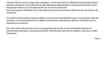 Certains d’entre vous l’ont peut-être remarqué : le site de la Ville est difficilement accessible depuis quelques semaines. Il a...